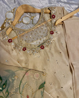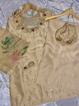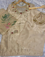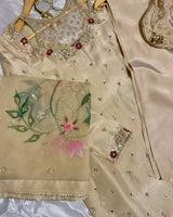 Turn heads in this beautiful ensemble featuring a hand-embellished shirt with a bold statement neckline, paired with comfortable palazzo pants and a hand-painted, embellished chiffon dupatta. Made from pure tussle silk in a soft skin gold shade, it’s perfect for festive occasions or special celebrations.