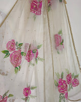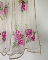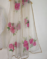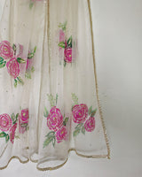 A beautiful expression of handcrafted luxury, this handpainted organza dupatta is adorned with delicate embellishments that add depth and shimmer. Its soft, flowing drape makes it perfect for special occasions.