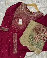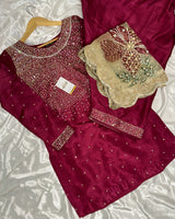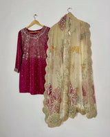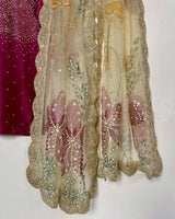 This elegant Maroon Farshi shalwar set is crafted from Korean raw silk and adorned with a shimmering all-over sequin work. The intricately embellished neckline and detailed sleeves add richness to the look. Paired with a stunning organza dupatta featuring hand-painted florals, delicate embellishments, and scalloped borders, this ensemble is perfect for weddings and festive celebrations.