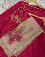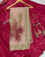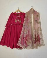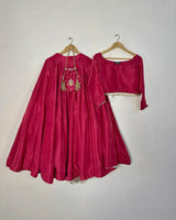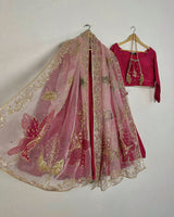 This formal lehenga set features a classic plain lehenga choli crafted to provide a clean and refined foundation. The simplicity of the silhouette allows the statement dupatta to take center stage, showcasing intricate handpainting enriched with heavy embellishments. Each detail on the dupatta reflects skilled artistry and meticulous craftsmanship, creating a striking contrast against the understated base and resulting in a beautifully composed formal ensemble.