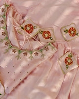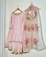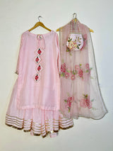 This elegant blush pink gharara set exudes timeless charm with its delicately embellished shirt featuring a beautifully detailed neckline and subtle all-over sequin accents. The flared gharara is finished with classic gold striped detailing along the hem, adding graceful movement and traditional appeal. Paired with a sheer organza dupatta adorned with hand-painted floral motifs, light embellishments, this ensemble is perfect for festive celebrations, weddings, and special occasions where soft sophistication makes the statement.