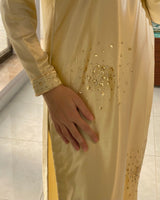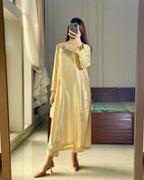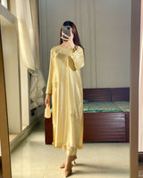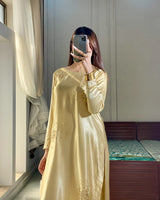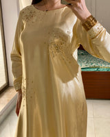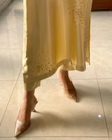A graceful two-piece lava silk suit in a soft butter yellow hue, designed to exude understated elegance. The shirt features allover scattered hand embellishments that add a delicate shimmer, enhancing its fluid and polished silhouette.
