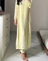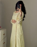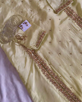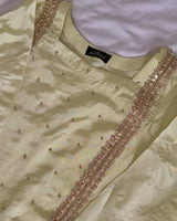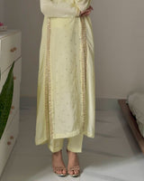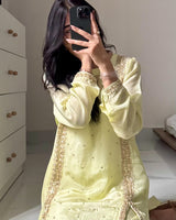 A graceful tussle silk shirt in a soft pastel hue, designed with two elegant front slits that add modern movement to the silhouette. Delicate embellishments are scattered across the fabric, while intricate borders along the panels enhance its refined appeal.