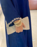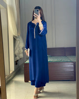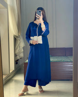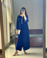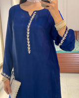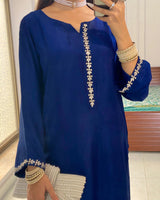 A sophisticated tussle silk ensemble in a rich deep blue hue, designed with a sleek and graceful fall. The shirt features delicate stone work along the neckline and sleeves, adding a subtle yet striking shimmer.